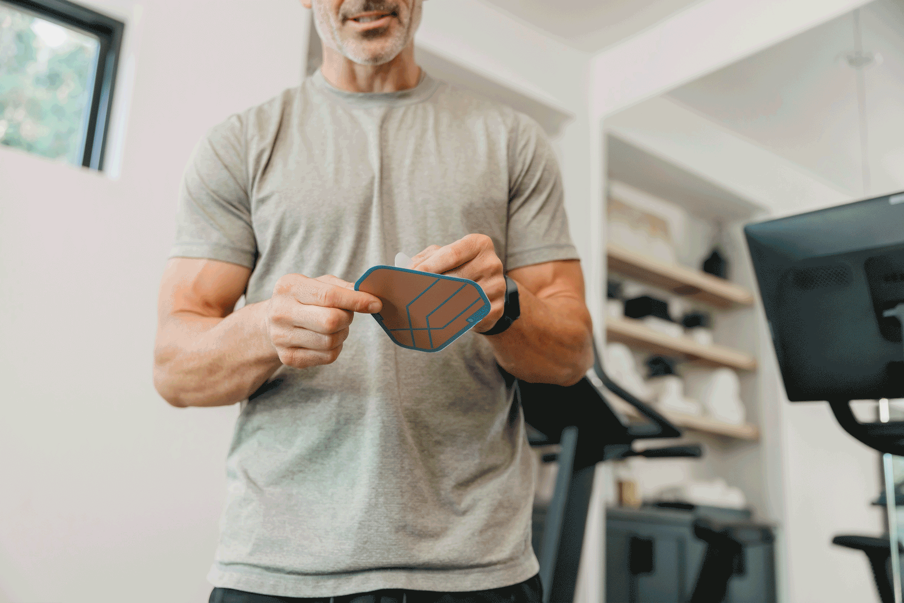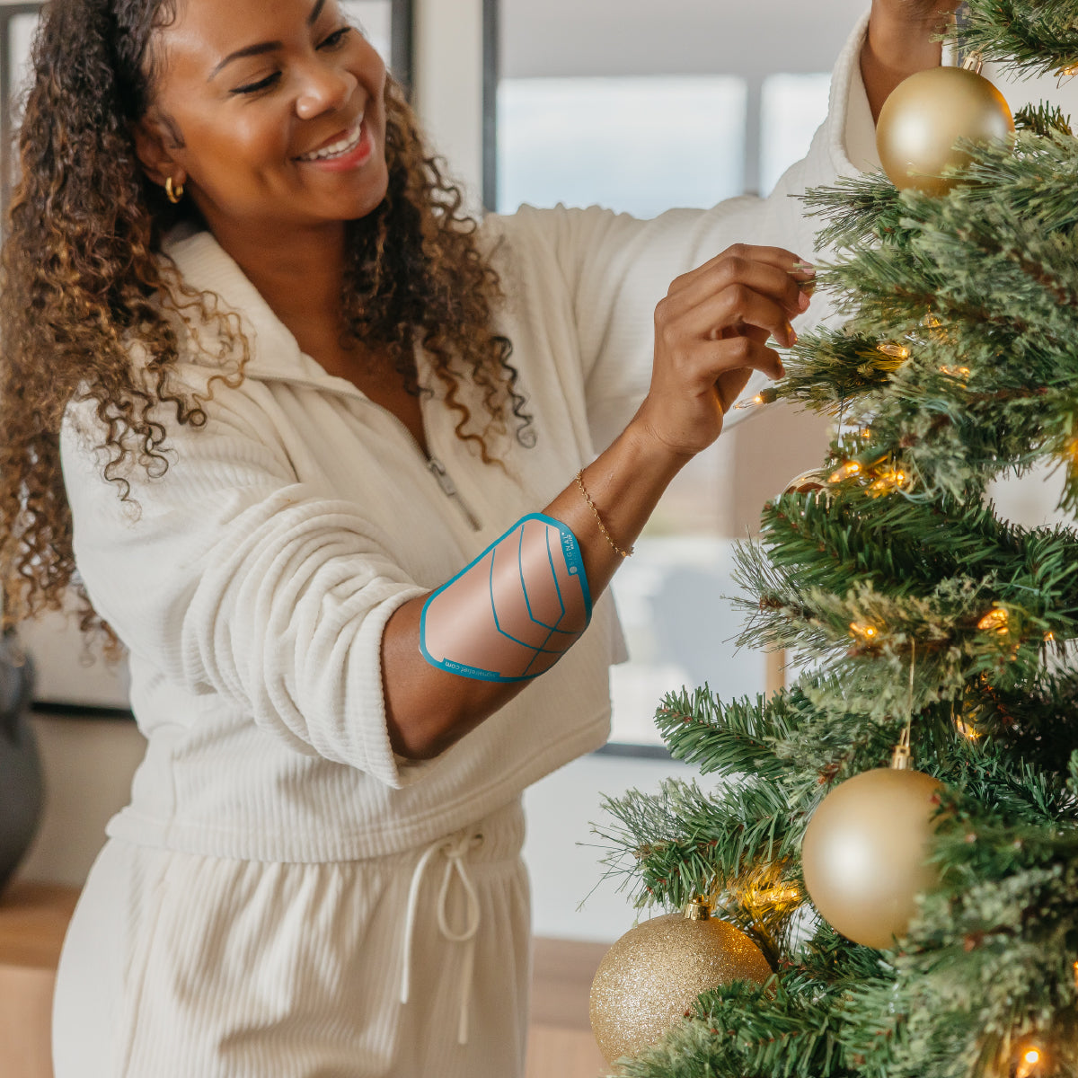 Man sitting on a couch and wearing a Signal Relief patch on his upper arm.